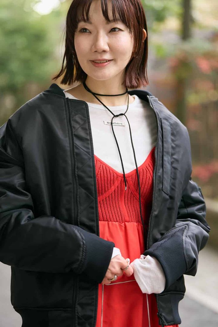 無駄を省いたシンプルな造りが気に入ったMA-1ダウンはユニクロ×ジル・サンダーコラボのもの。大きめサイズのメンズアイテムを、襟を抜いてゆるっと着たいと思って購入しました。パッと目を引く鮮やかな赤のワンピースが今日の主役!胸元のビスチェ部分はニット、スカートはジャガードという異素材切り替えのモードなデザインに惹かれました。足元はコンバースでカジュアルダウンさせ、星型のバッグで遊び心を加えました。