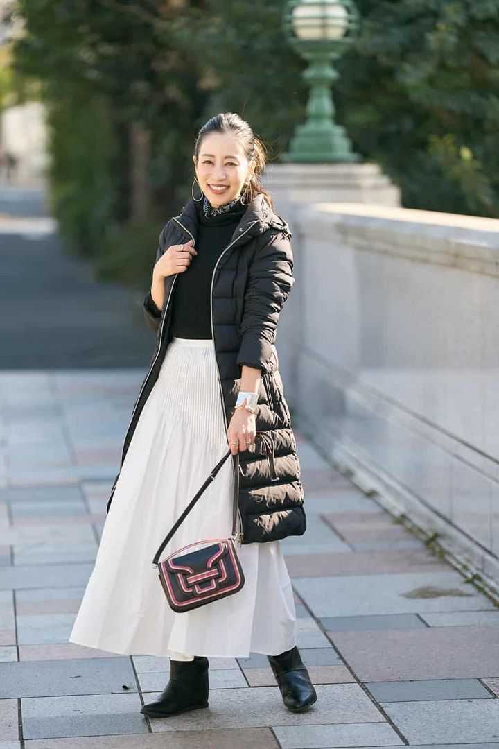 上品な光沢が気に入っているシルクのようなネオシャイニーナイロン素材のダウン。カジュアル過ぎずリュクスな印象になるので大人っぽく着られます。動くたびに艶やかに揺れる白サテンのスカートを合わせて、ダウンを着るときもフェミニンな雰囲気にまとめるのが好みです。あひるのチャームはバッグと同じValextraのもの。バッグ本体よりも圧倒的によく褒められるのでいい投資だったと思います(笑)