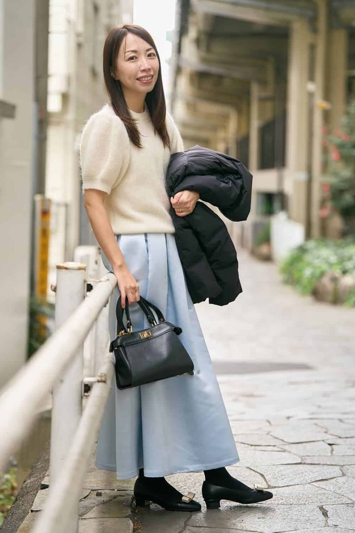 普段ロングスカートに合わせることが多いので、バランス良く見えるようにショート丈のダウンを選びました。カジュアルシーンだけじゃなく、キレイめにも使えるのでこの冬大活躍しています。黒の面積が多いと重くなり過ぎる気がするので、白ニットとカラースカートで軽やかに。お気に入りのTSURUの水色スカートは、上品な光沢で冬のダークな街で着映える1枚です。