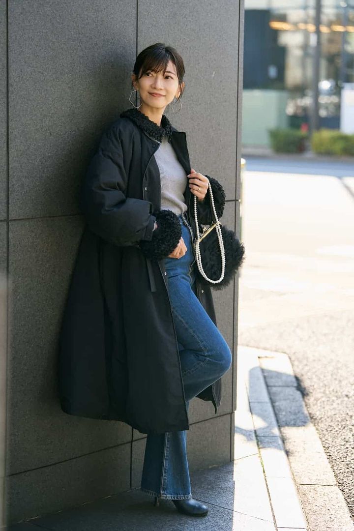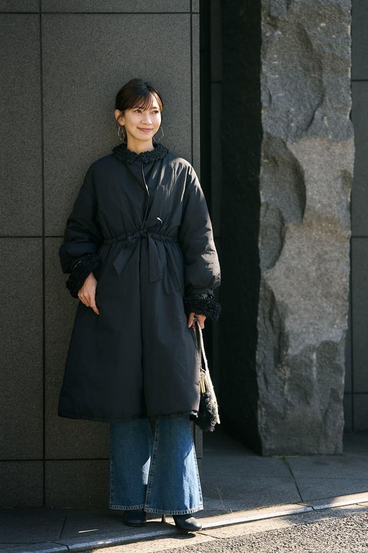 この黒ダウンはウエストで絞れるようになっていてコーデに合わせてシルエットを自由に変えられるところがお気に入りです。暖冬と言われていても、子供の応援や撮影で1日屋外に居る日にはやはりダウンは欠かせません。このダウンは暖かさも抜群!カジュアルになりすぎず可愛さもあるのが着やすいです。ベルボトムが新鮮なデニムで全体的にメリハリを効かせ、小物でクラシカルなイメージに仕上げました。