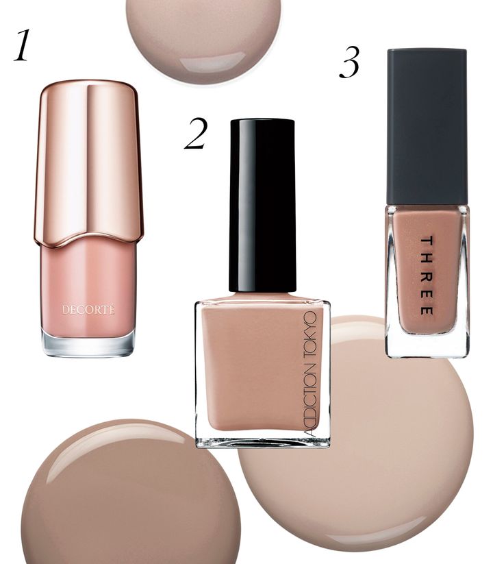 1 手元に品を与えるラテベージュ。スキニフィック ネイルラッカー 23 ¥3,300(限定品)/コスメデコルテ 2 まろやかになじむタイムレスなヌーディカラー。ザ ネイルポリッシュ + 047C ¥2,420/アディクション ビューティ 3 レッドをはじめとする繊細なパールを配合。輝きを秘めたセミマットな仕上がり。ネイルラッカー 21 ¥2,420/スリー