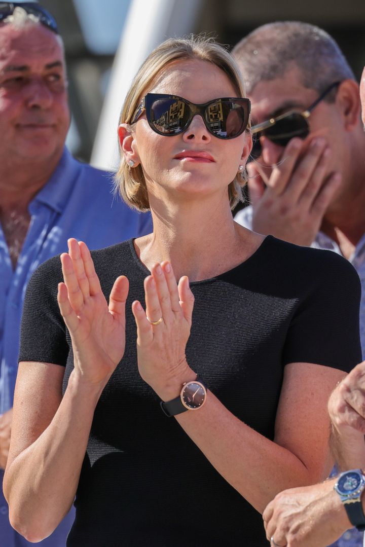 2024年9月、自身のチャリティ財団が主催する水上バイクレースに、黒Tシャツ姿で現れた公妃。このミニマルなルックに品格を漂わせていたのが、「ディオール」のウォッチ“ラ デ ドゥ ディオール”。ブラックの文字盤とベルトで、さりげなく統一感をもたせたルックに、公妃の洗練されたセンスが伺えます。
