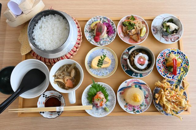 こちらのお店では、鮮やかな九谷焼の小鉢にお料理を盛り付けたランチをいただくこともできます。色鮮やかな器と地物食材をふんだんに使用した料理はまるで芸術作品のよう。自分で作ったお皿にどんな料理をのせようかと考える時間も心躍ります。