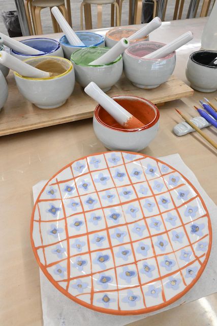 筆者が絵付けしたお皿。どんな風に焼きあがるかは、後日のお楽しみ。