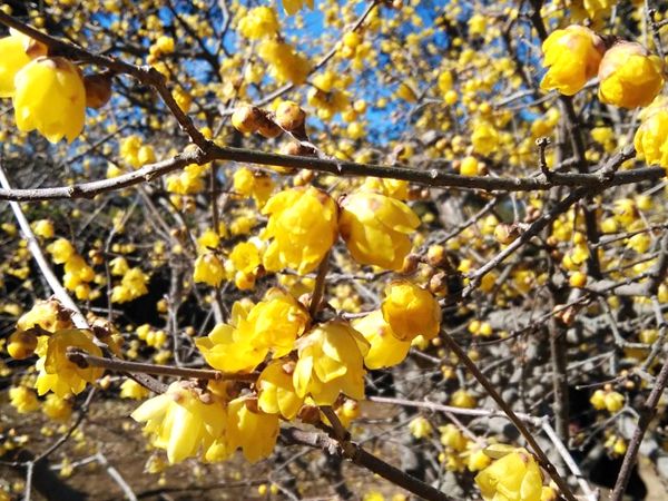 1月中旬から2月上旬という寒い冬の時期に見頃を迎える黄色いかわいいお花、蝋梅(ロウバイ)が咲き始めました。