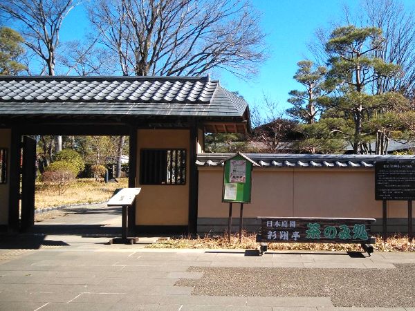 ロウバイ園のそばにある、日本庭園と茶室のある彩翔亭(さいしょうてい)では、お抹茶も飲めます。母屋の前にはステキな紅白の梅の木があります。
