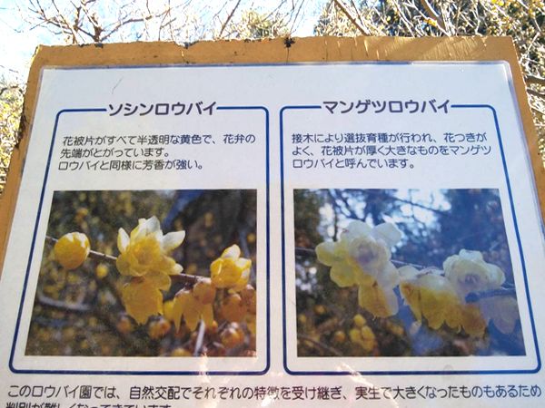 蝋梅(ロウバイ)は「ソシンロウバイ」と「マンゲツロウバイ」の2種類があるそうです。このロウバイ園では、自然交配でそれぞれの特徴を受け継ぎ、実生で大きくなったものもあるため判別が難しくなってきているそうです。