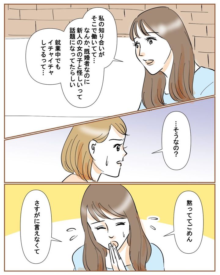 すると、「私の知り合いがそこで働いてて・・なんか、既婚者なのに新人の女の子と怪しいって話題になってたらしい。就業中でもイチャイチャしてるって・・」ともう一人が気まずそうに話し始め、「・・そうなの?」と信じられない思いで聞き返しました。「黙っててごめん。さすがに言えなくて」と必死に謝られましたが、彼女を責める気持ちは全く湧きませんでした。もし私が逆の立場だったら、やっぱり同じようになかなか言えなかったと思います。