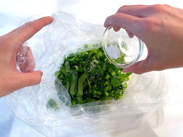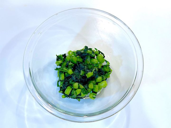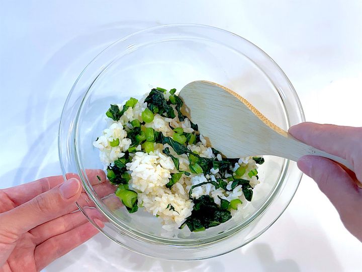 1. 菜飯を作る。小松菜は1cm角に切り保存袋に入れ、塩を加えてもむ。