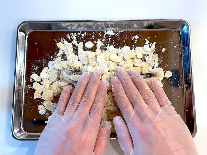 5. バットにスライスアーモンドを広げ、薄力粉を加えてよく混ぜる。