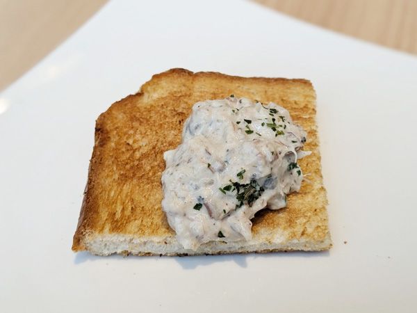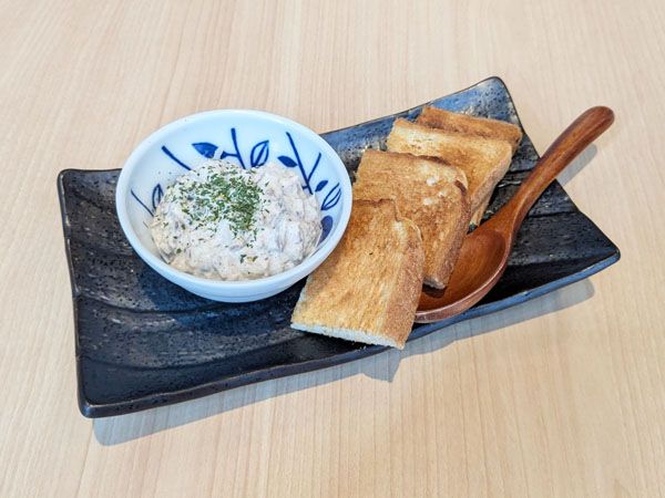「月花さば水煮」に玉ねぎ、マヨネーズ、黒胡椒を合わせたコクのあるソースに、トーストをディップして食べます。