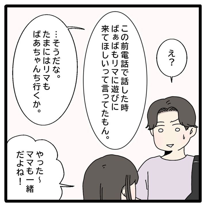 予想外の提案に驚いたのか「え?」と顔を歪める正志。しかしリマはお構いなしに、「この前電話で話したとき、ばぁばもリマに遊びに来てほしいって言ってたもん」と続けます。正志は少し考える素振りを見せた後「・・・そうだな、たまにはリマもばあちゃんち行くか」と承諾。するとリマは「やった~ママも一緒だよね!」と満面の笑みを浮かべました。