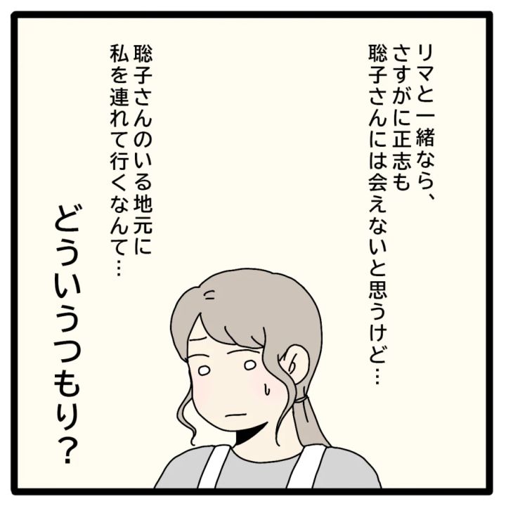 リマと一緒なら、さすがに正志も聡子さんには会えないと思うけど、聡子さんのいる地元に私を連れて行くなんてどういうつもり・・・?私は正志が何を考えているのか全く分かりませんでした。