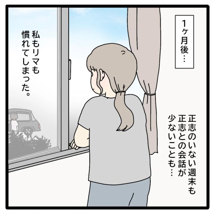 それから1ヶ月後。正志のいない週末も、正志との会話が少ないことも、私もリマも慣れてしまいました。今はただ、私たちに生活費を入れてくれるだけの存在。家族で会話することも、一緒に遊びに行くことも、一切なくなりました。