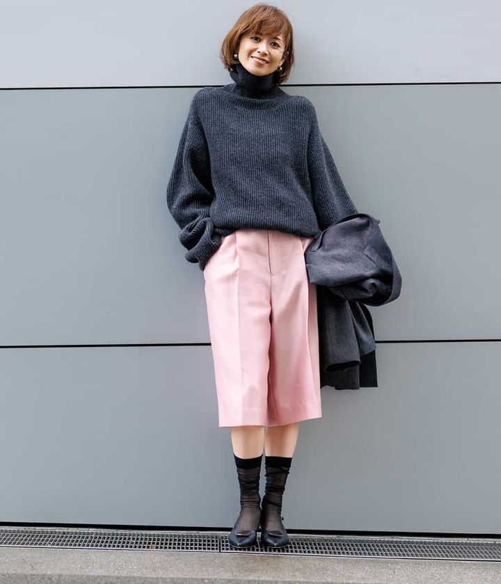 ともすると埋もれがちなポロニットですが、顔まわりが華やぐディテールで好印象をキープ。いざという時のママ友ランチに重宝しそうです。
