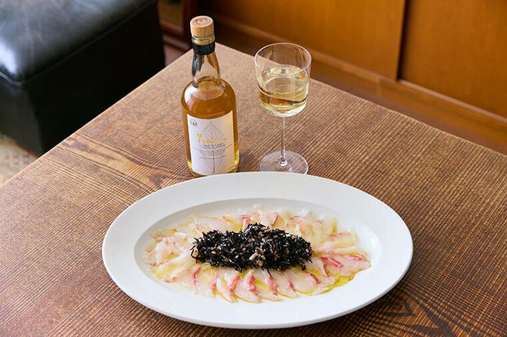 「鯛のカルパッチョとウイスキーを合わせるのは、正直に言って、ちょっとハードルが高い(笑)。鯛の甘味、繊細さに、ウイスキーのパワーをどう合わせるかが問題です。普段なら、鯛のカルパッチョに合わせるのはイタリアワインの白か、プロヴァンスの白です。果実味がしっかりしていて、キレのいいきれいな酸味があり、ジューシーで、よく冷やすことでおいしさが出るワイン。カルパッチョに合わせるならこのあたりがまず思い浮かびますね。それをウイスキーに置き換えると、どうなるのか。まずは、形から入ってみることにしました。ウイスキーを合わせるのですが、グラスをタンブラーではなく、ワイングラスにしてみたのです」