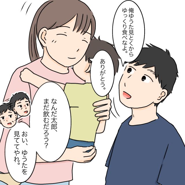 すると太郎が「俺ゆうた見とくから、ゆっくり食べなよ」と声をかけてくれました。私が「ありがとう」と言って、太郎にゆうたを任せようとしたその時、義父が「なんだ太郎、まだ飲むだろう?」と声をかけます。そして続けざまに義母へ向かって「おい、ゆうたを見ててやれ」と命令するように言いました。