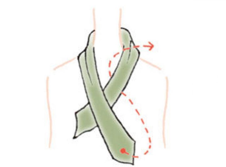 【2】両端を首の後ろで交差させ、前にもってくる。