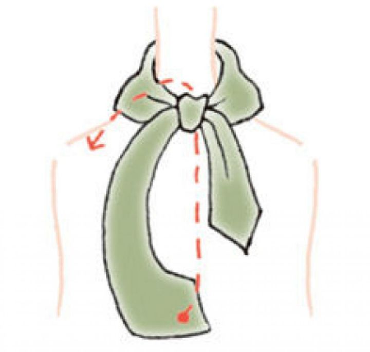【3】長いほうを結び目の下に通し、正面にたらす。