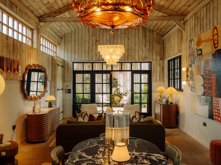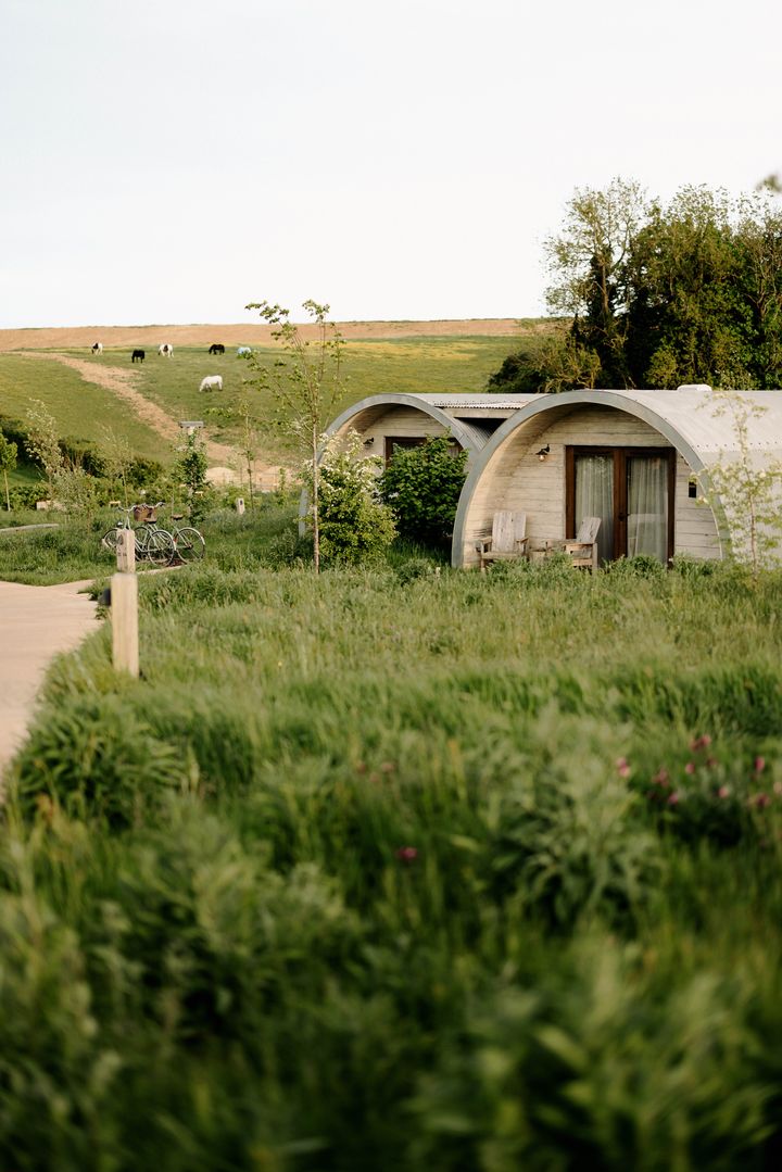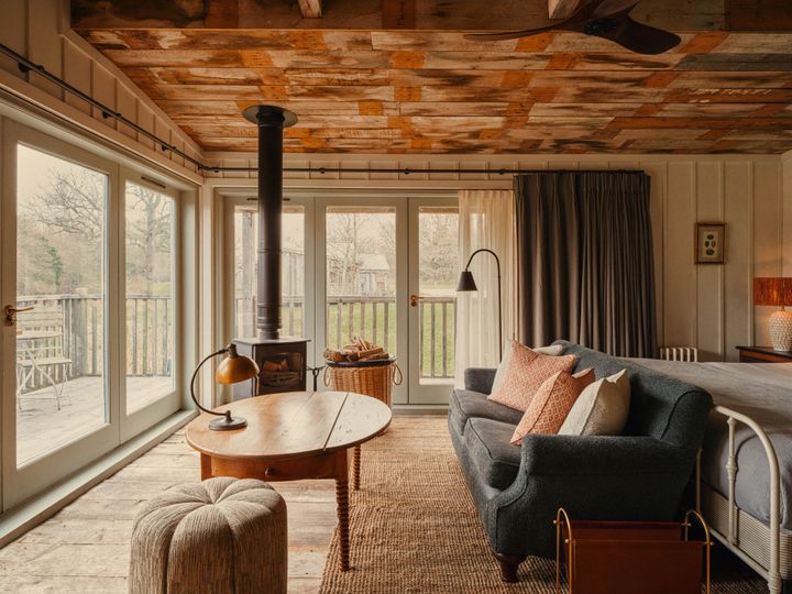 コッツウォルズにあるソーホーファームハウス。農場をのぞむキャビンからは、ゆるっと過ごす牛たちの姿が見えます。癒やし。 Hearst Owned