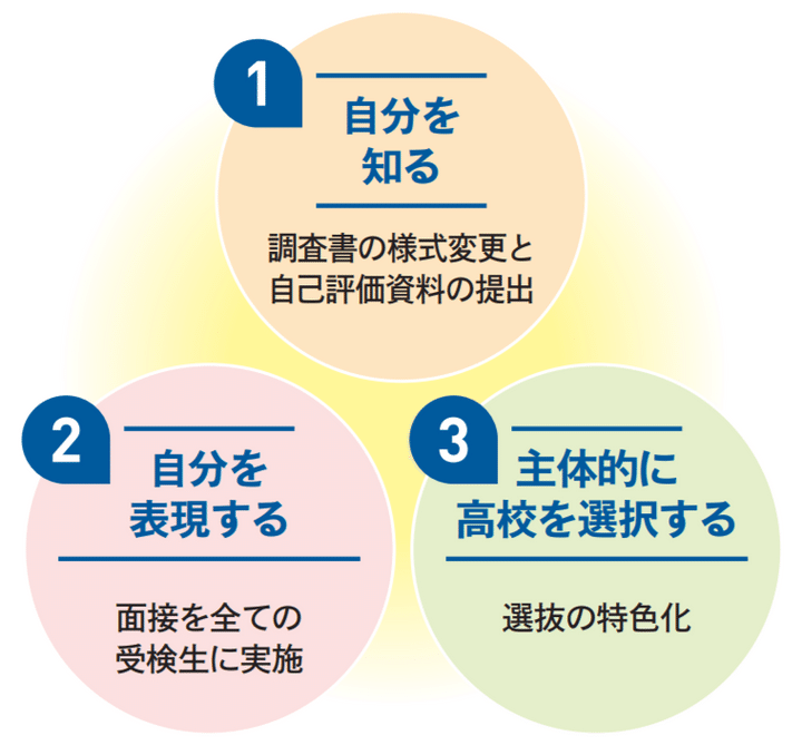 Q どのような準備をすれば良いですか? 高校入試は中学校生活の延長線上にあります。決して実績のあることだけではなく、なぜその活動に取り組んだのか、そこから何を学び、成長できたのかを深く考え、自分の言葉で具体的に表現できるように、中学校生活では学校内外でのさまざまな活動等に積極的に取り組んでください。