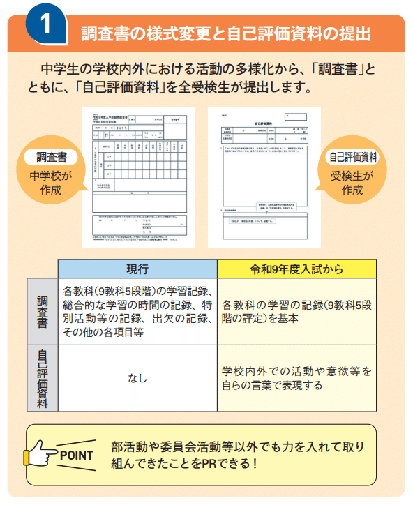 Q 部活動や生徒会活動、資格取得等の実績はどのような扱いになりますか? 新しい制度では、受検生が自らの言葉で表現して記載した「自己評価資料」を参考に面接を実施します。実績そのものではなく、実績に至るまでの過程(プロセス)や意欲、身に付いた力、学びに向かう力などを評価します。