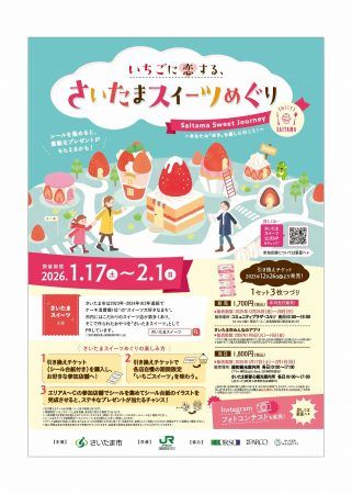 さいたま市の浦和区、南区などの26店舗が参加し、旬のイチゴを使った限定スイーツが味わえる「いちごに恋する、さいたまスイーツめぐり」が開催されています。 1セット3枚つづりのチケット(1800円)を購入し、スイーツと引き換えできます。 2/1(日)まで。