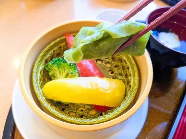 地場産のお野菜と仙台あおば餃子が丁寧に蒸されていました。 もっちりとした皮の餃子は、噛むほどに肉のうま味が広がります。