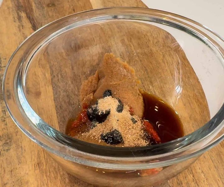 2. ボウルにみそ・豆板醤・甜麺醤・みりん・しょうゆ・砂糖を入れ、よく混ぜ合わせる。