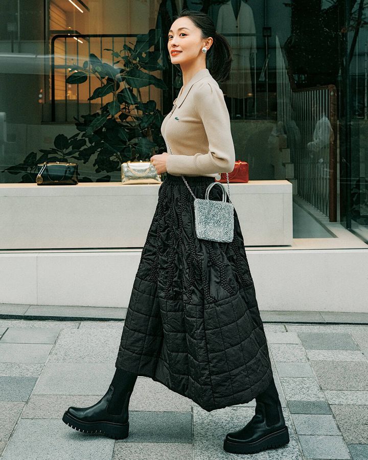 華やかなデザインながら、高いコスパ力も魅力なボリュームスカートは、キルティングが高見え&マンネリコーデを気負わずに更新してくれます。モノトーンだから黒パンツ感覚で取り入れたい。