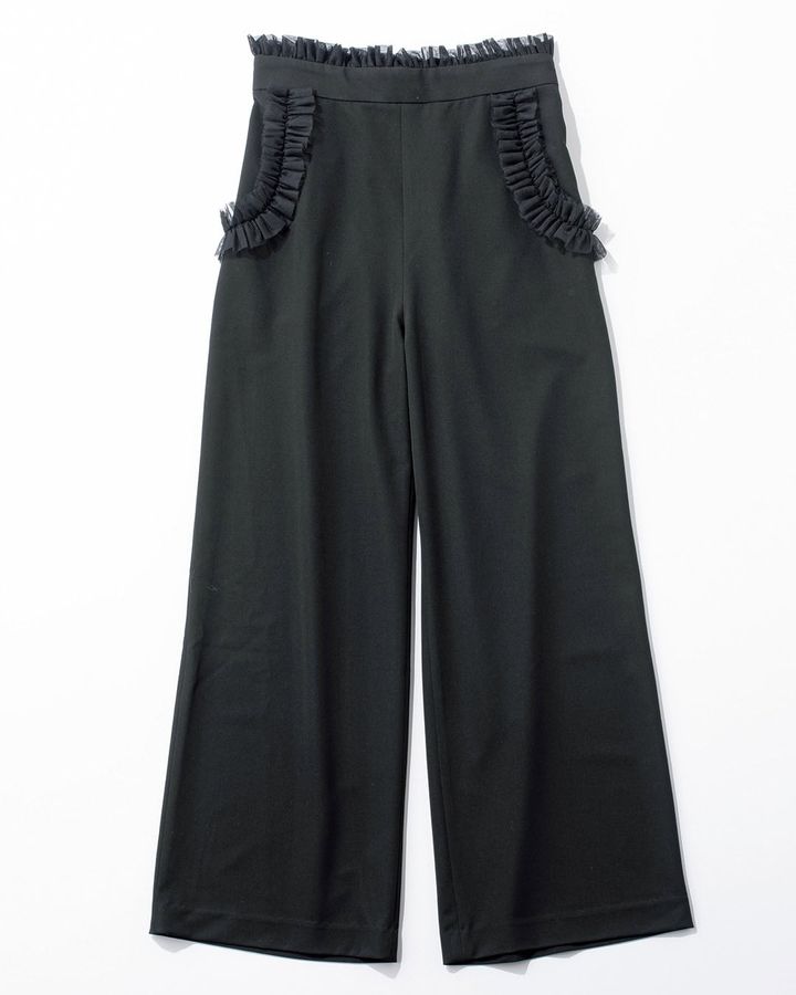 実際はハイウエストではなくとも、ウエスト部分のチュールフリルがウエスト位置を高く見せ脚長効果が期待できます。ポケットにもチュールのタックフリルをあしらい、大人でも取り入れやすい甘さに仕上げました。ウエスト後ろはゴムなので長時間穿いていてもストレスがありません。シルエットはどんな体型の人でも挑戦しやすい程よいワイドシルエットになります。