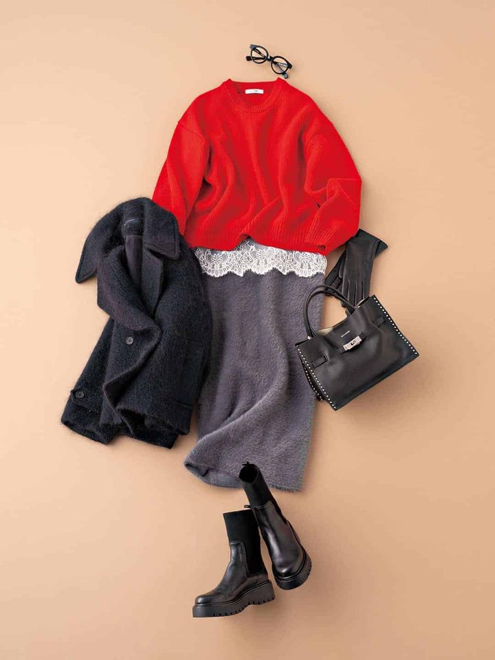 スカート¥35,200ニット¥46,200(ともにスローン/ザ ショップ スローン新静岡セノバ店)レースカットソー¥19,800コート¥72,600(ともにマルティニーク/マルティニーク ルミネ横浜)バッグ¥46,200〈ヴィオラドーロ〉ブーツ¥34,100(ともにアルアバイル)メガネ¥71,500(アイヴァン 7285/アイヴァン 7285 トウキョウ)グローブ¥49,500(デンツ/真下商事)(デンツ/真下商事)