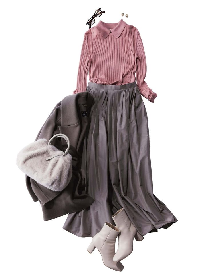 ニット¥34,100(スローン/ザ ショップ スローン 新静岡セノバ店)スカート¥38,500コート¥96,800(ともにカオス/カオス丸の内)バッグ¥39,600(銀座かねまつ/銀座かねまつ6丁目本店)ブーツ¥28,600(ダイアナ/ダイアナ 銀座本店)イヤリング¥5,400(アビステ)メガネ¥46,200(アイヴァン/アイヴァン 東京ギャラリー)