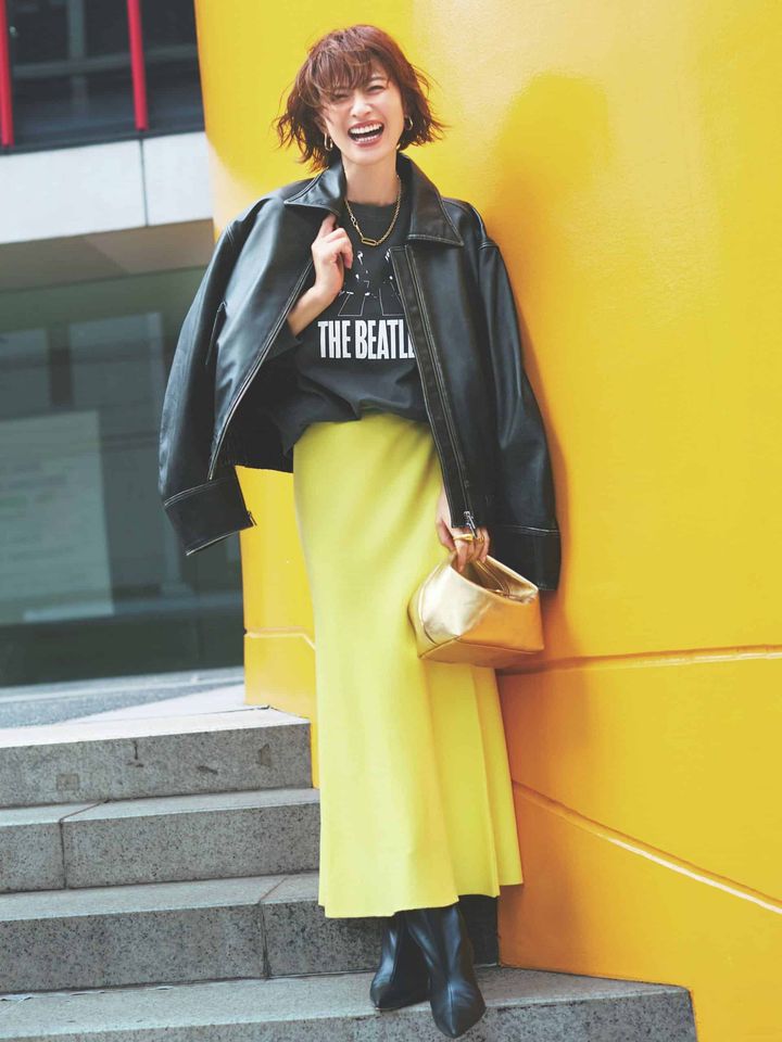 真っ黒な辛口なアイテムと爽やかなレモンイエローのギャップが、洒落感の決め手。レザーの強さが軽減されて、親しみやすい印象にシフトします。派手色でも直線的なシルエットなので、細見えバッチリです。