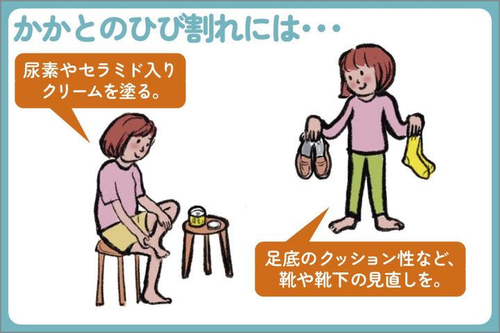 「かかとのひび割れは乾燥だけでなく摩擦も大きな原因です。靴の中で足が動かないようフィット感を見直し、足底に当たる部分のクッション性がよい靴や靴下を選ぶことも、再発防止には重要です」