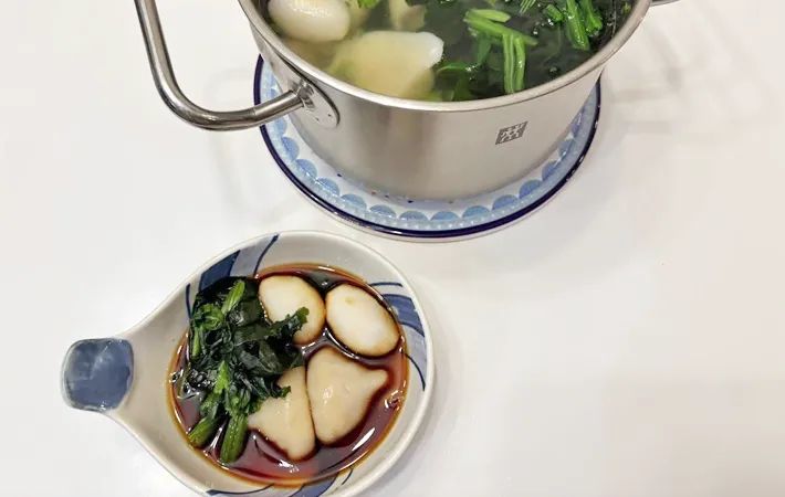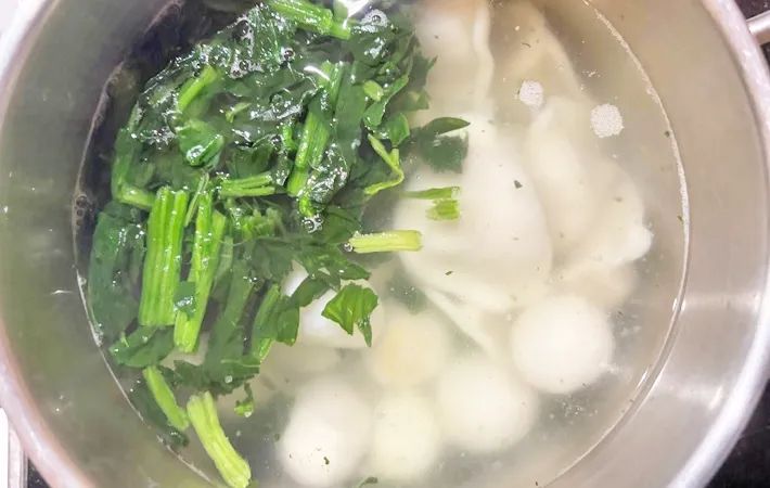 湯が沸いたら、サトイモ、餃子、ほうれん草の順番で、火の通りにくい食材から鍋に入れてゆでます。