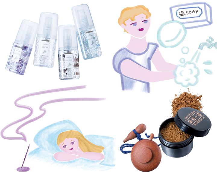 就寝前に一日のモヤモヤを禊ぐことはとても大事。寝ている時に私たちはエネルギーの調整をします。スプレーに入っているのもホワイトセージや水晶など、浄化作用のあるものでバッチリですね。目的に応じて選んで。