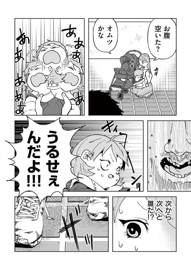 ママさんと繁華街にお出かけした赤ちゃん(転生者・和史)。前抱っこされた赤ちゃんが興奮していると、怪しげな2人組がこちらを見つめていて…!?