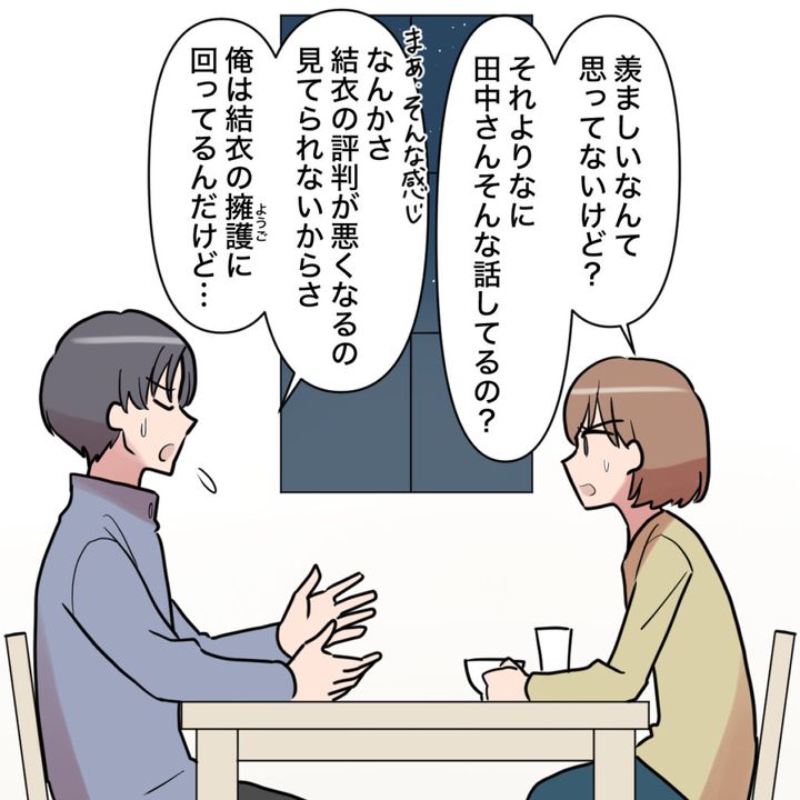 田中さんの言うことを信じ切って、結衣さんの話を全く聞こうとしない和真さん。本当「何も知らない」のに、「もう庇いきれない」と、悪いのは結衣さんの方だと決めつけてしまっているのでしょうか。彼女を守るどころか、田中さんに引き寄せられてしまっている和真さんが、とても情けなく感じますよね。