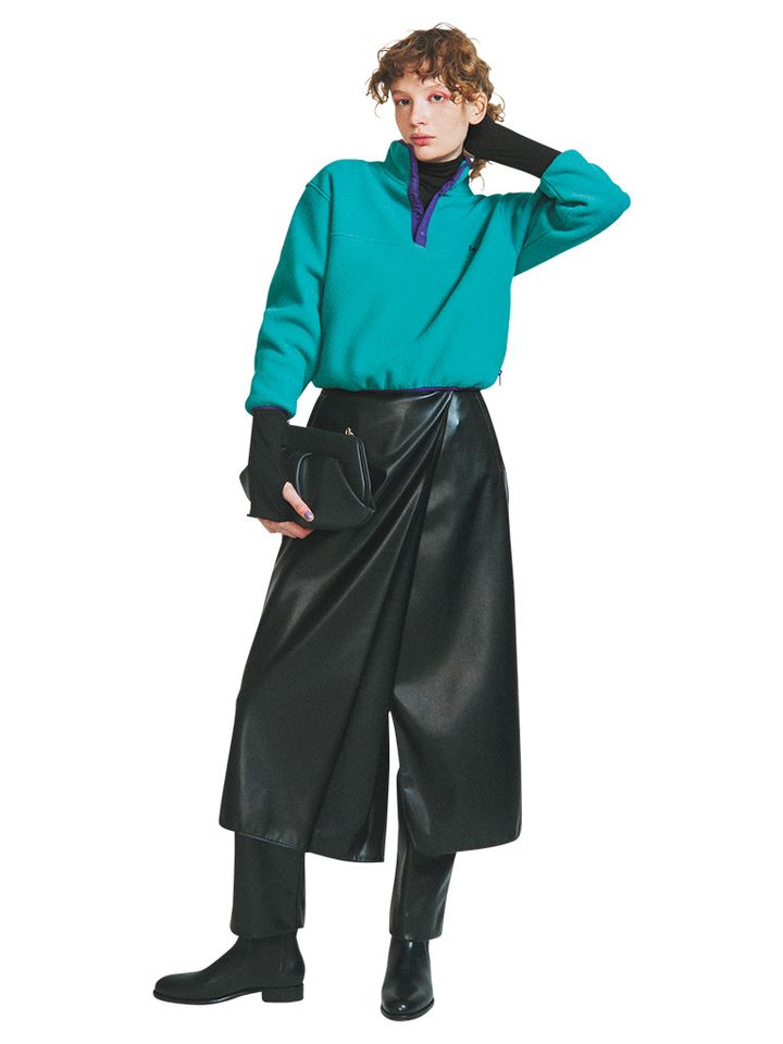 グリーンフリースプルオーバー/SEA(エスストア) 中に着た黒タートルネックトップス/ロバートピーミラー×ジーンズ ファクトリー(ジーンズ ファクトリー 卸団地本店) 黒レザースカート/ボールジィ、バッグ/テモワール(ともにトゥモローランド) 黒レザーパンツ/オスロー(フィルム) ショートブーツ/ジャランスリウァヤ(ジャランスリウァヤ 日本橋)