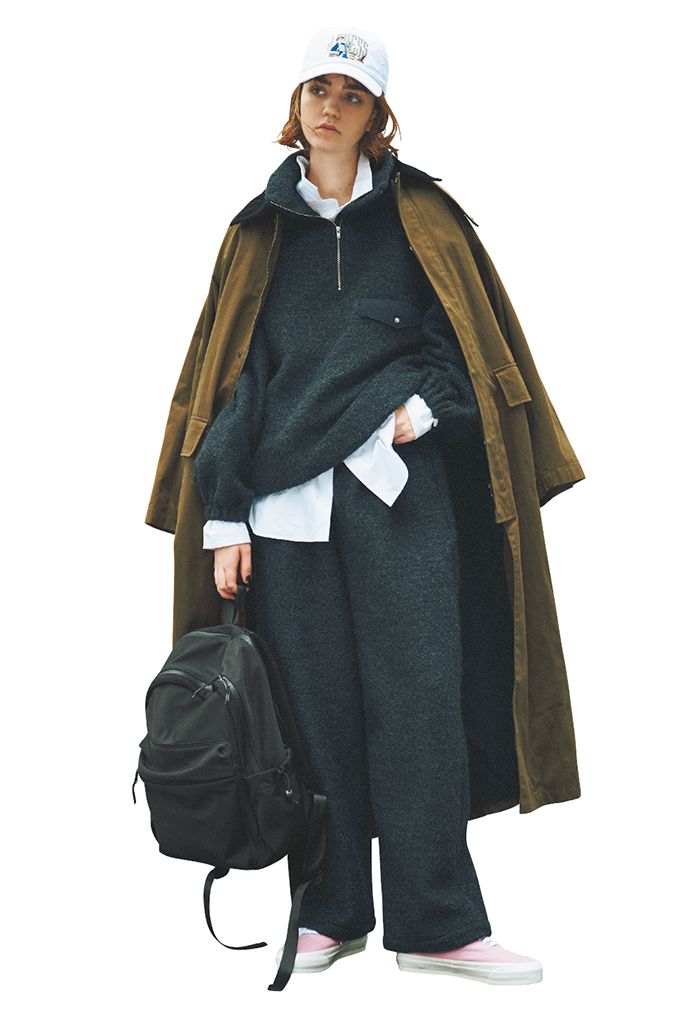白シャツ/ATON(ATON AOYAMA) カーキロングコート/SACRA(インターリブ) チャコールグレーハーフジップフリーストップス、チャコールグレーベルトつきフリースパンツ/ともにOblada(シンチ) 白ロゴキャップ/J.PRESS BOY’S Collection(J.PRESS & SON’S AOYAMA) 黒リュック/イムラム スニーカー/Vans(Vans Japanカスタマーサポート)