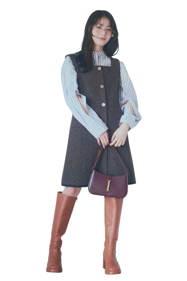 ワンピース 20,900円/アプワイザー・リッシェ シャツ 9,790円/dazzlin サングラス 1,760円/SPINNS バッグ 9,900円/チャールズ&キース(チャールズ&キース ジャパ ン )ロングブーツ39,600円/ALM.