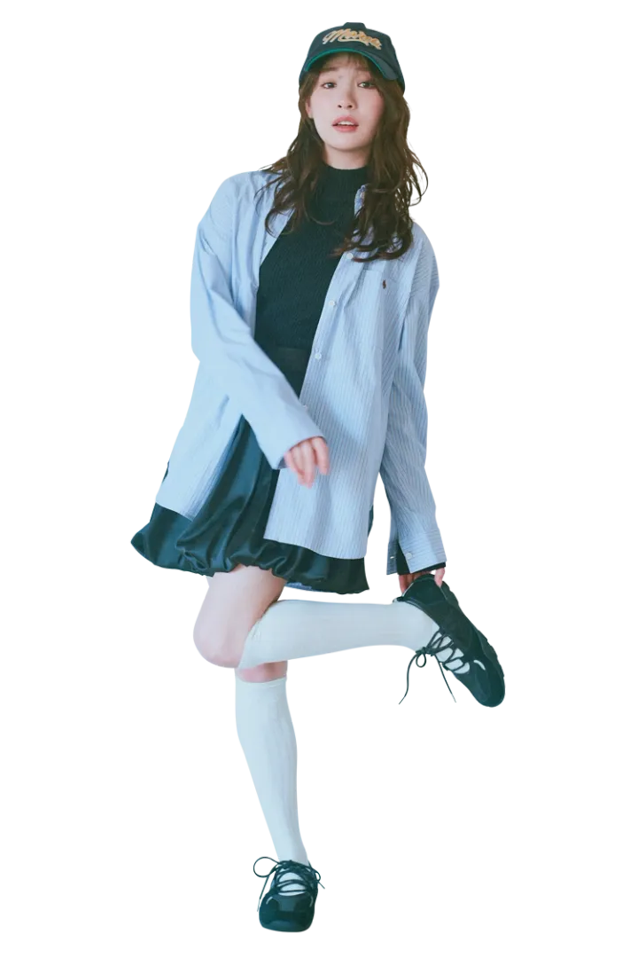 シャツ 18,700円、バルーンスカート 16,500円/ともにリランドチュール タートルニットトップス 5,940円/EMODA ルミネエスト新宿店 キャップ 6,600円/Mardi Mercredi(MARDI MERCREDI JAPAN)スニーカー 15,400円/Rockfish Weatherwear(blaseout)ソックス/スタイリスト私物