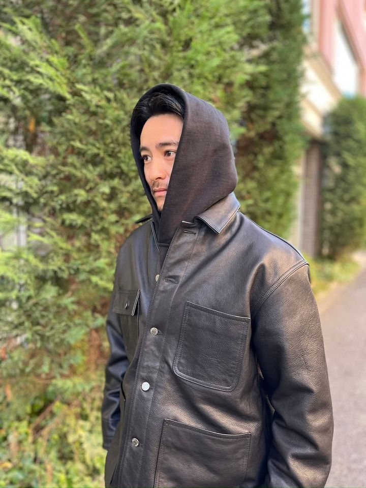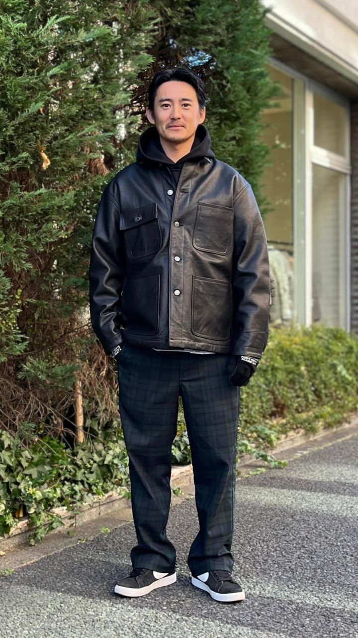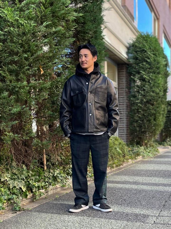 防寒というとボリューミーなダウンなどを選びがちだけど、福本さんはカウレザーのジャケットをセレクト。「普段は電車通勤なので、あまりにも防寒性の高いアウターだと暑すぎて気持ち悪くなっちゃうんです(笑)。なので、このレザージャケットくらいの厚さが、僕にとってはちょうどいい。もちろんダウンを着ることもありますが、街ではライトめを選ぶことが多いです。厚手のダウンを着るのは、子どものサッカーを観戦するときくらいですね」