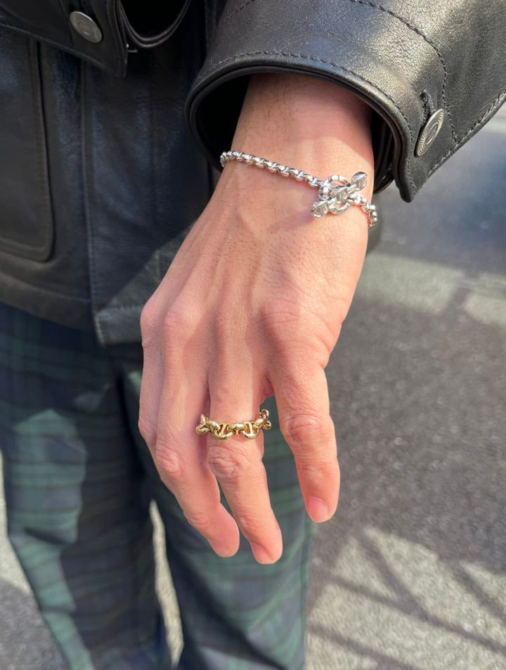イエローゴールドのリングとホワイトゴールドのブレスはホーセンブース。クラス感漂う手元で、若者のカジュアルスタイルと差別化を図っているのもさすが!