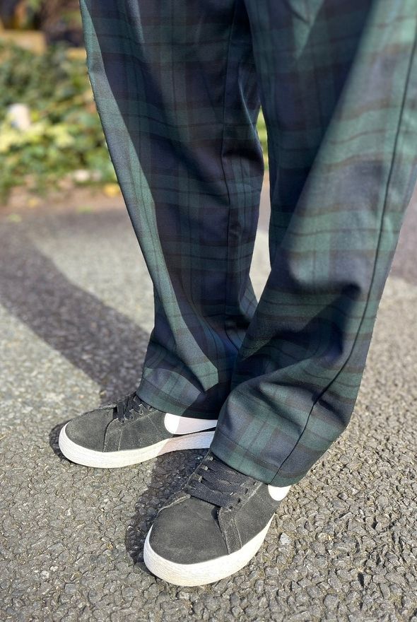 「着こなしはシンプル派。基本的にブラック無地でまとめることが多いですが、今回はブラックウォッチを差し柄として投入してみました」と福本さん。確かにパンツが絶妙な差し柄になって、ブラックコーデをより印象的に見せていますよね。あと、個人的に気になったのは素材使い。カウレザーとスエットの素材のコントラストが絶妙で、ブラック合わせをリズミカルに演出しています。トップスとボトムスのシルエットのバランスもイイ感じですし、女性も参考になるポイントが満載の着こなしだと思いました!