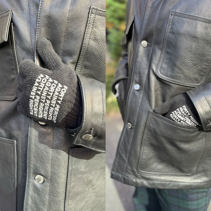 ブラックの染めとレタリングで、軍手がこんなにもおしゃれに! シンプルコーデのスパイスにもなっています