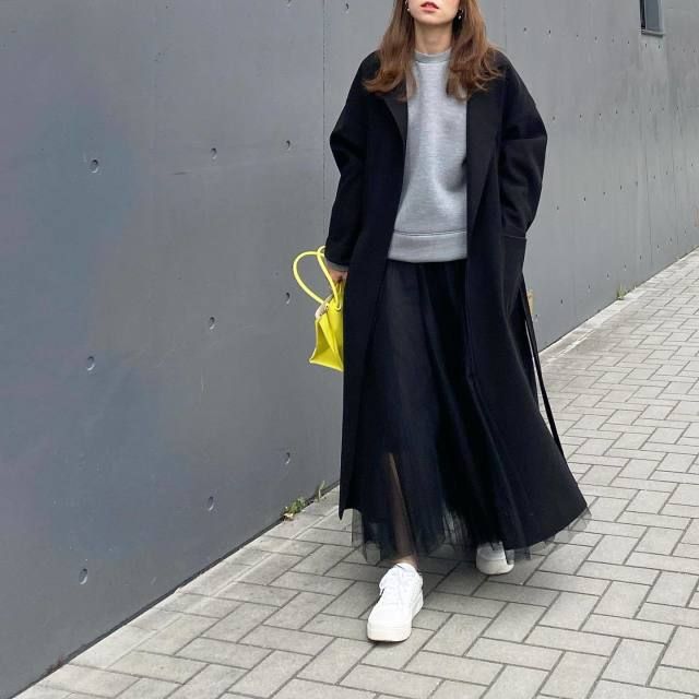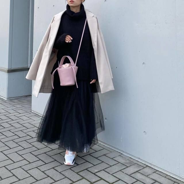 次にご紹介するのは、ロングコート×チュールスカートの組み合わせ。モードでおしゃれなスタイリングが楽しめますよ。ロングコートだから足元まで暖かく、スカートの抜け感のおかげでコーデ全体のバランスアップも叶います。