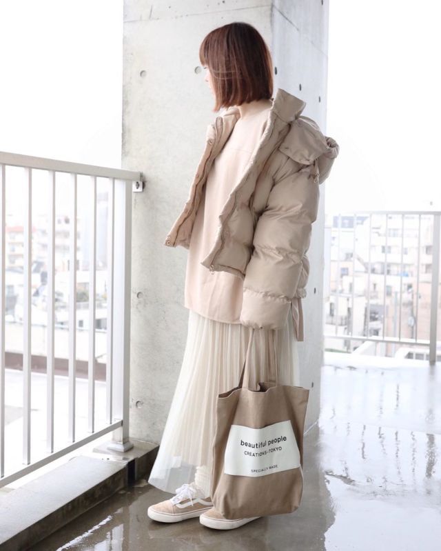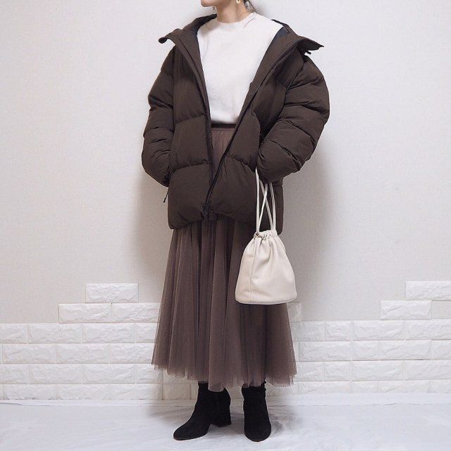 まずご紹介するのは、チュールスカートにダウンジャケットを合わせた冬コーデ。カジュアルなアウターとガーリーなチュールスカートのミックス感がおしゃれな組み合わせです。ダウンでしっかり防寒しつつ、チュールスカートの軽やかさでダウンの重さを感じさせない。そんな着こなしに仕上がりますよ。