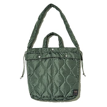 カーキキルティングバッグ(40×47×12) 5,940円/タイオン インナーダウン専門ブランドこだわりの軽量素材。左右のひもをしぼれば丸みを帯びた巾着型に変化。